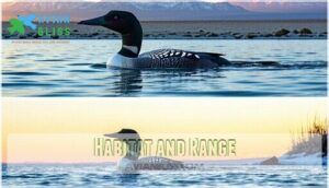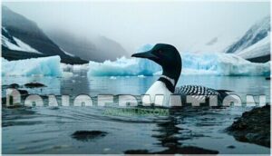 This strategic placement lets them escape quickly from predators while maintaining easy access to marine ecosystems that support their diet. Unfortunately, habitat loss from climate change and industrial development threatens these critical breeding grounds, making waterbird species conservation increasingly urgent for this remarkable loon bird’s survival.