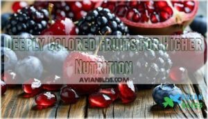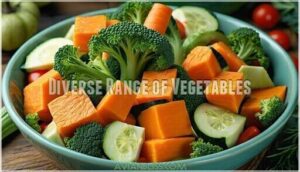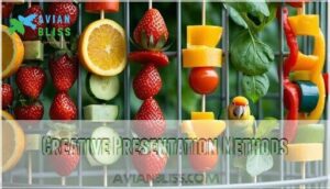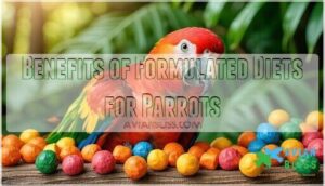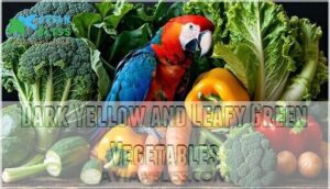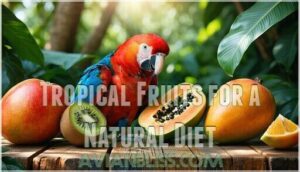 You’ll want to fill your parrot’s bowl with a rainbow of fresh vegetables and fruits, as these vibrant foods pack essential vitamins and minerals that pellets alone can’t provide.