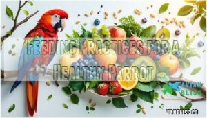 You’ll want to feed your parrot a balanced diet with 60-80% high-quality pellets, 20-30% fresh vegetables and fruits, and limited seeds as treats.