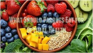 You’ll want to feed your parrot 60-80% high-quality pellets, 20-30% fresh vegetables and fruits, plus occasional whole grains and legumes. Skip seed-heavy diets—they’re nutritionally incomplete and cause health problems.