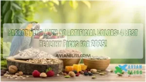 Stick to natural alternatives like foods with real flavor origins. Reading labels helps you avoid preservative dangers. It’s about healthier parrots, free of synthetic dyes and artificial colors.