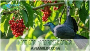 Their acrobatic feeding style includes upside-down feeding positions to reach fruits and berries.