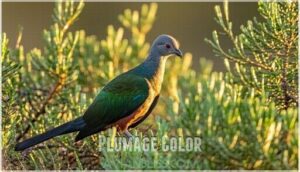 - Olive-brown body feathers with subtle green sheen that shimmer in sunlight