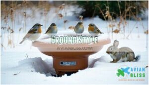 You’ll find three main types of bird bath heaters designed to keep water accessible during freezing weather: classic pedestal styles that stand independently in your yard, deck-mounted units that attach to railings or ledges, and ground-level models that accommodate various wildlife.