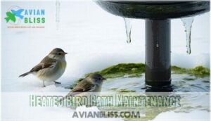 - You’ll need to maintain your heated bird bath by changing water every few days, cleaning thoroughly every two weeks, and brushing off snow regularly to prevent algae buildup and ensure optimal heater performance.