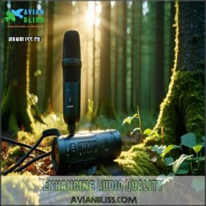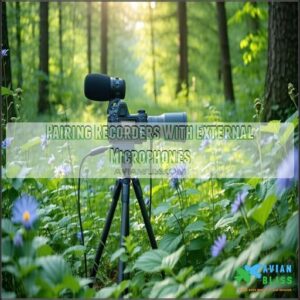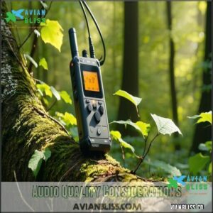 Consider using a recorder with high SNR for ideal results. Choose gear maximizing clarity for nature’s finest tunes, ensuring a high signal-to-noise ratio and good audio quality.