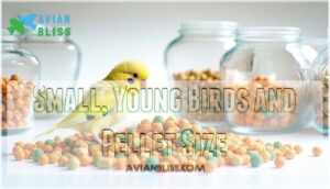 You’ll need to match your bird’s pellet size to their physical capabilities, as younger birds and smaller species can’t manage large pellets while senior parrots may struggle with tiny ones.
