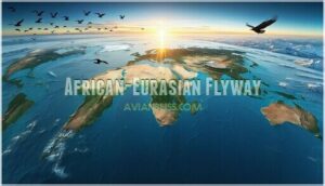 Collaboration across nations guarantees survival along this flyway, linking Europe, Asia, and Africa.