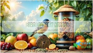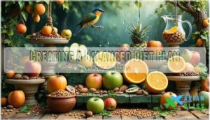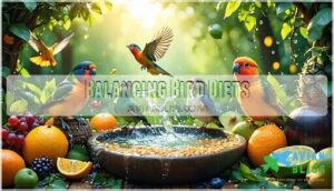 A balanced bird diet needs both for ideal bird nutrition. Don’t forget dietary fiber—it keeps their digestion running smoother than a well-oiled machine, ensuring optimal nutrition.