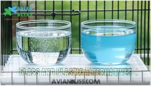 However, cost comparison favors plastic bowls for budget-conscious bird owners. Consider your caged birds’ behavior when choosing between these bird hydration options.
