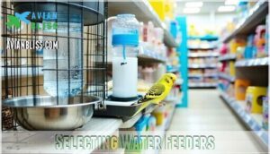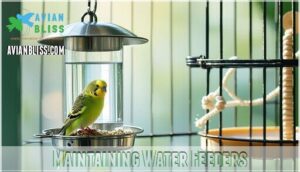 You need to keep water feeders clean and well-maintained to guarantee your bird stays healthy. Regular cleaning and monitoring help prevent bacteria and keep water fresh.