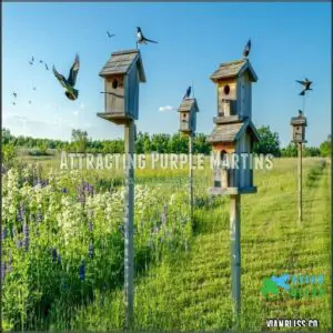Make certain proper ventilation, starling-resistant entrances, and regular maintenance to attract purple martins, with regular maintenance being key to their attraction.