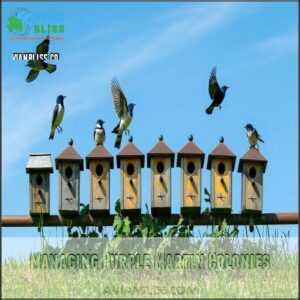Regular birdhouse maintenance, including birdhouse waterproofing and pest control, helps your colony thrive while keeping your setup ready for next season. This ensures a healthy environment with proper drainage systems and prevents harmful conditions, making it essential for the well-being of your martins with effective cleaning routines.