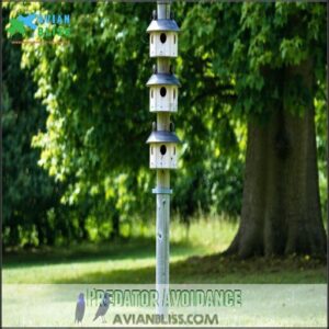 Use martin house predator guards, like aluminum baffles, to block raccoons, squirrels, and snakes. Proper baffle placement—at least 48 inches from climbable objects—stops unwanted visitors in their tracks.