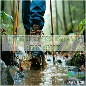 Trail hazards like slippery mud demand sturdy, waterproof gear and careful steps.