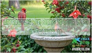 - You can attract red birds to your yard by setting up feeders with black oil sunflower seeds, providing shallow water sources, and planting native California plants like coast live oak and toyon that produce berries.