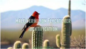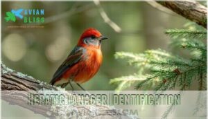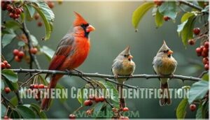 - You’ll need to focus on key identifying features like size, beak shape, and plumage patterns – male Summer Tanagers are completely red, Pine Grosbeaks have crossed bills, and Northern Cardinals sport distinctive black face masks with prominent crests.