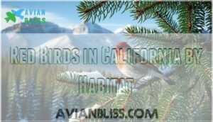 You’ll find several distinct categories of red birds across California’s diverse habitats, from common backyard species like House Finches to seasonal visitors such as Summer Tanagers.
