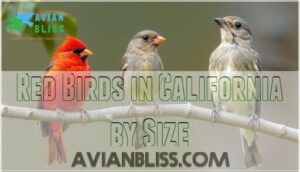 You’ll find red birds in California range from tiny 4-inch finches to impressive 10-inch woodpeckers, making size a useful identification tool.