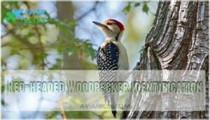 These distinctive woodpeckers display striking red heads with black-and-white dalmatian-like patterns.