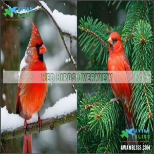 Cardinals are a specific species, bright red with a black face mask, while red birds can include many species.