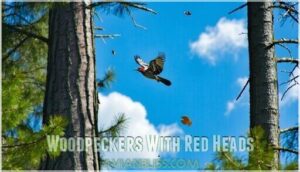 You’ll find red-headed birds across North America displaying vibrant crimson crowns, caps, and facial patches that serve as striking identification markers and breeding signals.