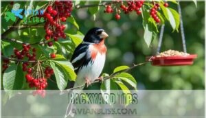 You’ll spot striking plumage patterns that make rose breasted grosbeaks unmistakable in your backyard.
