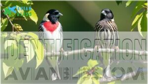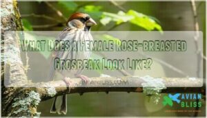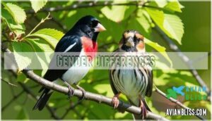 You’ll easily recognize Rose-breasted Grosbeaks by their stocky build and distinctive triangular bills. These medium-sized songbirds measure 7-8 inches long with striking differences between males and females.
