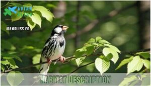 During breeding season, these birds favor moist deciduous and mixed forests with dense shrubs.