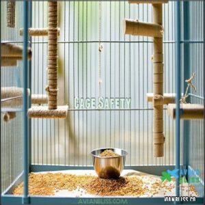While supervising playtime protects your feathered friend, their cage environment requires equal attention. Ensuring cage safety prevents injuries that would need treatment with bird safe antiseptic.