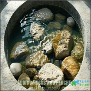 Keep perch stability in mind—wiggly stones won’t do! Proper rock placement guarantees safety, and different perch heights let birds drink, bathe, or relax comfortably without slipping.
