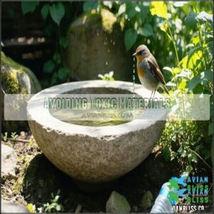 Material alternatives like stone or copper offer excellent bird safety without toxic substances. For a rustic aesthetic, consider repurposed stone options for your bird bath.
