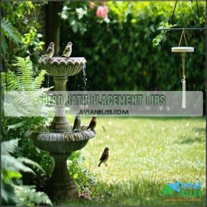 For ideal bird health and safety, place your bath about 6-30 feet from feeders to minimize cross-contamination, while keeping the water cool enough to prevent harmful algae growth that could sicken your avian visitors.