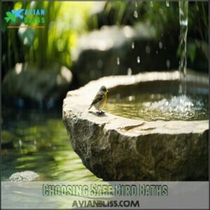 You’ll need to select your bird bath carefully, focusing on non-toxic materials like stone or copper that won’t harm your feathered visitors when they drink or bathe.