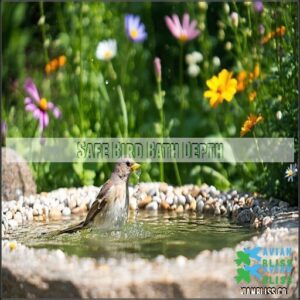 You’ll protect visiting birds from drowning by keeping water levels in your bird bath between 1-2 inches deep at the center, with edges gradually sloping to just half an inch.