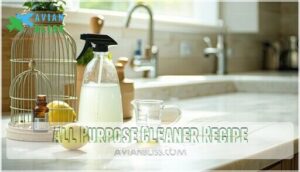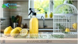 Lemon juice creates a powerful natural cage cleaner that tackles mineral deposits with its antibacterial properties. This citrus powerhouse offers safe alternatives to harsh chemicals while providing effective DIY recipes for your feathered friend’s home.