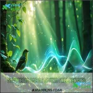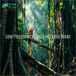 While small birds produce high-pitched chirps, you’ll find their larger counterparts creating deep, resonant low-frequency calls that travel impressive distances.