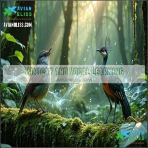 You’ll discover that birds employ a sophisticated array of communication techniques, including songs, calls, and remarkable mimicry that serve essential functions from territorial defense to mate attraction.