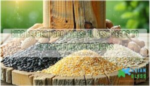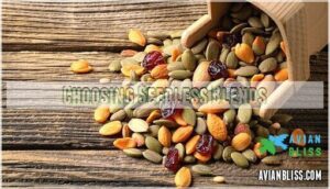 When choosing seedless blends, focus on options like nut-based mixes, dried fruits, and seed-free formulas that meet small birds’ nutritional needs.