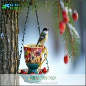 Create your own suet feeder using simple materials like wire cages, mugs, or coconut halves. Place these DIY bird feeders in shaded locations to prevent melting during warmer days. Mix cayenne pepper into your suet recipes—birds can’t taste the heat, but it effectively deters squirrels.