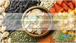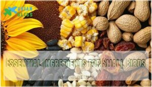 You’ll need specific ingredients in your small bird food mix to guarantee proper nutrition and energy levels for your feathered visitors.