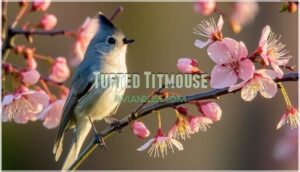 It builds nests in natural tree cavities or nest boxes about 10 to 20 feet above ground, usually raising one brood per breeding season. The fun Tufted Titmouse is an addition to any backyard habitat, providing color and activity with its jaunty crest and energetic movements.
