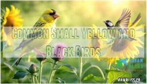 - You’ll identify small yellow and black birds like the American Goldfinch and Hooded Warbler by their bright plumage, unique markings, and distinct songs.