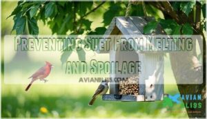 You’ll want to protect your suet from spoiling and becoming a breeding ground for harmful bacteria that can compromise bird health.