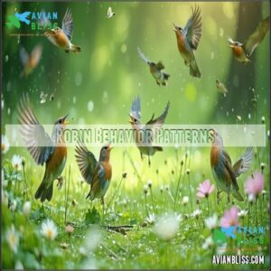 When robins aren’t singing to each other, they’re engaging in complex social dynamics. You’ll notice these birds aren’t always friendly neighbors—territorial disputes erupt frequently during breeding season.