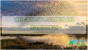 - You’ll witness spectacular murmurations when Tree Swallows gather in massive flocks during migration seasons (late August through May), creating synchronized flight patterns over marshes and coastal areas that help them evade predators and conserve energy.