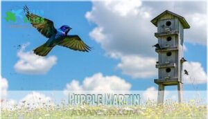 Take a moment to picture a summer day, when the air is alive with the cheerful presence of vibrant birds. Among these colorful aviators, you can spot the Purple Martin effortlessly gliding through the sky, its bluish-purple hues catching the sunlight as it captures insects mid-air to fuel its energetic flight.
