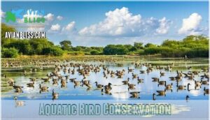 Beyond fenced pond environments, you’ll find aquatic bird conservation operating on a massive scale through protected wetlands.