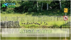 Lakeshore refuges create controlled environments where you’ll notice sturdy fencing protecting vulnerable waterfowl from predators and invasive species.