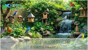 Specialized sanctuaries like rookeries concentrate on breeding colonies, and private sanctuaries—from backyard havens to rescue centers—fill vital conservation gaps. Each sanctuary type serves unique conservation purposes, creating an extensive network that’s more effective than any single approach alone, through different approaches, with critical stopover points, and providing temporary shelter and predator-free breeding grounds.